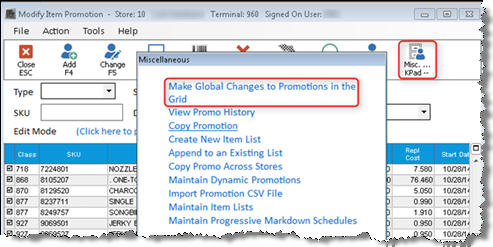 In the Modify Item Promotion window— where the message "Use <MISC> Option 1 to enter Promo Type and Start/End Dates" is displayed— click Misc, then select "Make global changes to promotions in the grid."