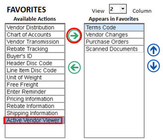 - Under Favorites, in the Available Actions box, scroll down and click Active Vendor Viewer, then click the arrow pointing to the right. The entry moves to the “Appears in Favorites” box.