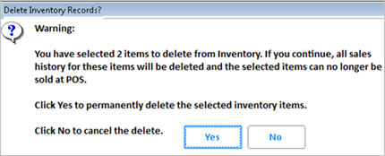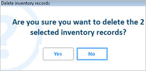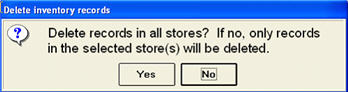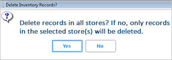 - Multistore: If prompted, select Yes to delete records in all stores, or select No to delete records in just the store specified in the Store field of the Inventory Viewer. (Note: the prompt does not display if you selected All Stores or a Store Group in step 3, or if you don't have security bits 6 and 12 to delete items from all stores.)