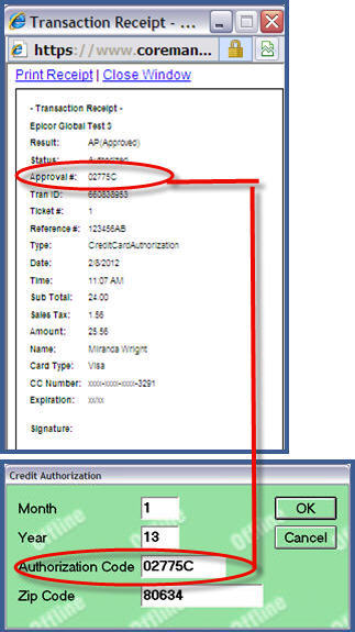Copy approval code from receipt Locate the number in the Approval # field displayed on the transaction receipt. Enter this number in the Authorization Code field displayed on the Totals screen of Offline Point of sale to complete the transaction. Tip: With your Transaction Receipt displayed, you may use your mouse to Copy the approval code and then Paste it into the Authorization Code field. |