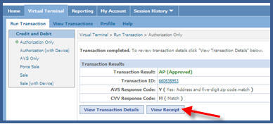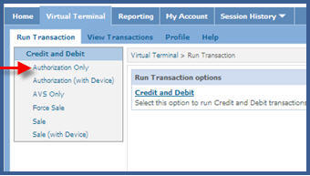 Select “Run Transaction” From the Virtual Terminal tab, click Run Transaction from either location on the screen. |