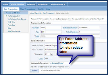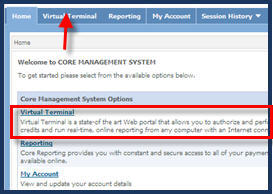 Access Virtual Terminal Click the Virtual Terminal tab, or the link on the Home tab. |