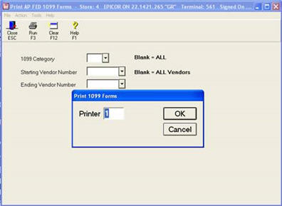 Print 1099 forms The Last Year fields from Vendor Maintenance are used when running 1099 forms. Therefore, you must first complete the previous procedure to clear vendor year-to-date fields before printing 1099 forms. 1099 Forms Using Eagle for Windows Laser 1099 forms can be printed with Eagle for Windows.