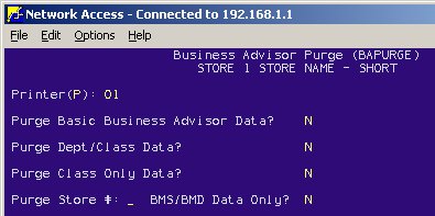Use BAPURGE (available only from Network Access) to tell the system which Business Advisor data to purge. This function works with the constants you set up in Function MBA (Modify Business Advisor Constants) to determine how much information to store and when to purge old information. Epicor Software Corporation™ recommends you run BAPURGE at least once every three months. The function does not require a quiet system to run. Normally BAPURGE is run from a queue, however, it can be run manually if you needed to immediately create space on the system.