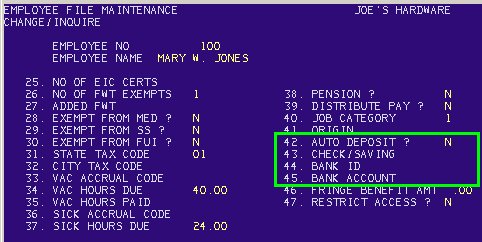 To use this feature, an Epicor representative must change option 3092 "Standard Direct Deposit Format" to Yes in Options Configuration. |