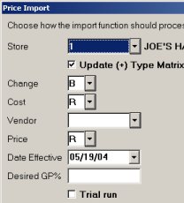B = Both cost and price are imported from the data file. C = Cost only is imported from the data file. M = For L-type SKUs, cost imported is the market cost. The system calculates a new replacement cost (cost per stocking unit) from the market cost (cost per purchasing unit). The system then calculates a new retail price based on the new replacement cost and the desired GP% for the item (from Inventory Maintenance). Market cost, replacement cost, and retail price change. If you use this option, the Cost field option must be K and the Price field option must be R. P = Price only is imported from the data file. The new price is not rounded using the Price Rounding Table (PRO). R = Cost only is imported from the data file. The new cost and the desired gross profit percent for the item (from Inventory Maintenance) are used to calculate a new price. Only the price changes; the cost does NOT change. S = Cost only is imported from the data file. The new cost and the desired gross profit percent for the item (from Inventory Maintenance) are used to calculate a new price. Both the cost and price changes.