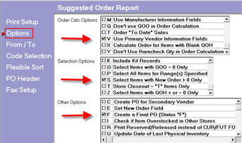 From the Suggested Order Report (RSO), click Options, and select an Order Calc Option based on the desired vendor (V= Primary, M=Manufacturer or I=Alternate Vendor). At Selection Options, select S, and at Other Options, select F.