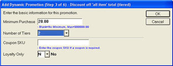 In the Minimum Purchase field, enter 20.00, since the consumer must spend at least $20 to receive a gift card. In Number of Tiers, enter 2, since this is a two-tiered promotion $20 to $800, and 800.01 and above. Note; Coupon SKU and Loyalty Only are optional fields, but are not utilized in this example.