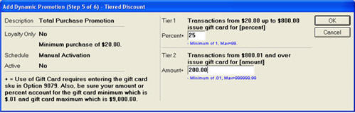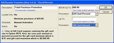 In the next dialog, do the following: In the Description field, enter the message you want to print on the receipt, in the "20.00 Up To" field, enter 800.00, and in the Promotion field, select Gift Card Percent. Then click OK.