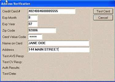 Review the information you entered in the dialog. Press Tab to highlight the Test Card button, then press Enter. The system sends to ProtoBase an "authorization only" transaction request for $1.00, as well as the AVS and CV information, which then submits the transaction to the processor.