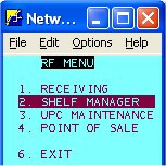 These options can also be set up in Options Configuration, so that you don't have to enter them every time you use RF Shelf Manager. Once you've set them up in Options Configuration, simply press <Next Screen> to bypass these options in Shelf Manager.