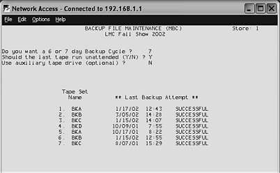 Backups are performed each night as part of the automated SHUTDOWN procedure. You should have a different tape for each day of the week. The tapes must be labeled electronically so the system knows that it is backing up to the correct tape. If the wrong tape is put into the tape drive, the backup will not overwrite the tape. Tapes must be labeled BKA through BKG for stores operating seven days a week. For stores operating six days a week, tapes must be labeled BKA through BKF. If you are backing up to CD or USB, you do not need to label these since they are labeled on the fly. This task is performed from Network Access. |