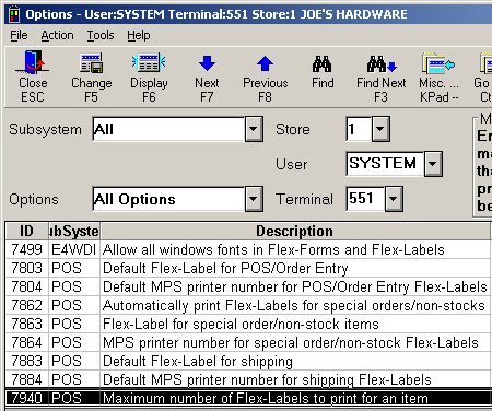 (ID# 7864) MPS printer number for special order/non-stock Flex-Labels— This is the printer for labels printed automatically by GPO or RRP. Option ID# 7862 is set to G, R, or B. Enter a network printer already configured in MPS (Modify Printer Status).