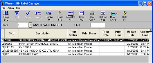 Use the following procedure to use the Bin Label Changes Viewer, which contains a list of items that need a bin label because they have changed (i.e. their description or manufacturer part number has changed) or they are new (just been added to inventory). In the Bin Label Changes Viewer, you can view item changes, delete item change records, or change their status to "printed" or "not printed."