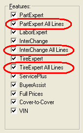 The All Lines Selection feature in User Setup lets you see parts from manufacturer's lines that aren't included in your current supplier. This can be very useful if your current supplier does not carry parts for a particular lookup. The All Lines feature is individually available for PartExpert, InterChange, and TireExpert. The feature can be turned on or off for a particular user for a specific database feature.