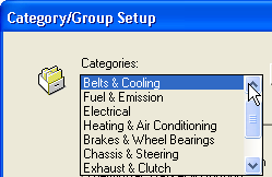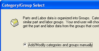 The Category/Group Select dialog box lets you manually select the labor or part groups and categories that LaserCat 3 uses. The dialog box displays when you finish selecting supplier coverages.