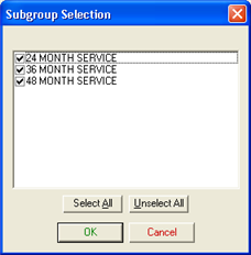The Subgroup Selection dialog box displays during a LaborExpert or ServicePlus lookup if the vehicle manufacturer has monthly service requirements in addition to regular mileage services.