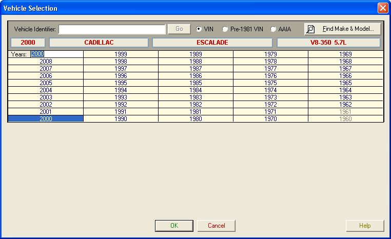 Vehicle Selection displays the year, make, model and engine of your current lookup in red. You can make selections from the dialog box or use the Find Make & Model button.