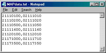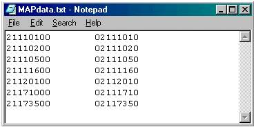 The following example will use a tab-delimited file created in Notepad to add data to the Eagle function MAP. If you display the file in Notepad it will look like this: