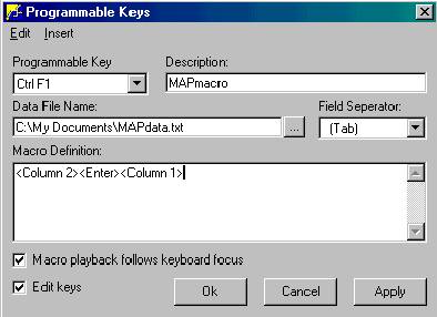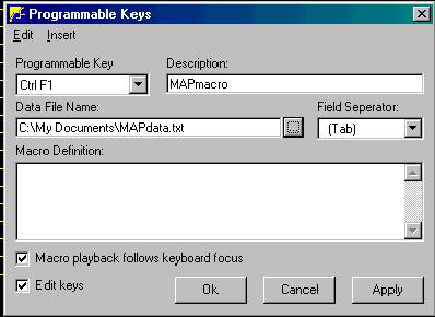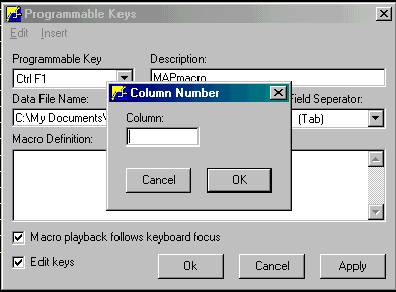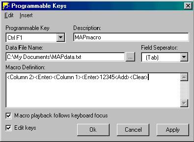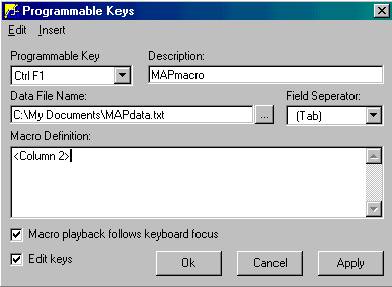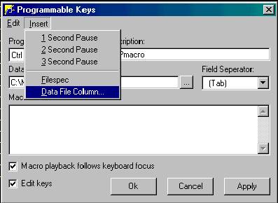 The next step is the "Macro Definition". This step can be somewhat tricky and some experimenting may be necessary to make the macro do what you intend. IMPORTANT- Along the top of the Programmable Keys window there is a short menu bar. This menu bar has only two choices, Edit & Insert. In this example, the first keystrokes you would make on the MAP screen would be typing an alternate part number. Since the purpose of this macro is to eliminate keystrokes, this macro will take the data from your file and type it for you. Therefore, the first thing you want the macro to do is to take the data from the file and insert it into the field "alternate part #" of MAP. To program the macro to do this, click Insert on the menu bar, then click Data File Column. See below.