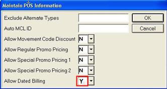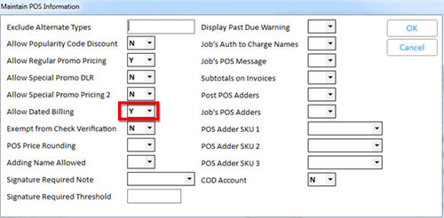 In Customer Maintenance, indicate the accounts for which you allow Dated Billing. Also, verify that the Charge Allowed field is set to Y, or the customer will not be able to receive Dated Billing.