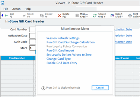 In Point of Sale, click Misc-KPad, then select Gift Card Viewer. The In-Store Gift Card Header window displays.
