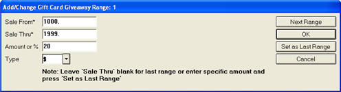 In the Add/Change Gift Card Giveaway Range dialog that displays, do the following: