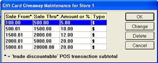 Use the Gift Card Giveaway Maintenance dialog to set up the various threshold amounts and the corresponding gift card amounts you want to use for Gift Card Giveaways. For example, you might set up a $1000 threshold for a $20 gift card, a $1500 threshold for a $30 gift card, etc.