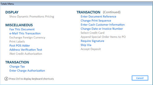 If you press menu in the Totals Screen (you have pressed total), then the following dialog box displays: