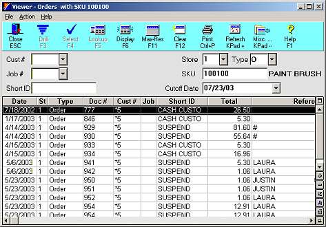 The Orders Viewer displays with all orders containing the item listed in the grid.