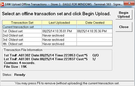 After completing an Offline Point-of-Sale session, use the following procedure to upload transactions from the PC to the Eagle system.