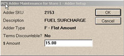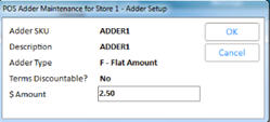 If you selected Adder Type F, enter the flat amount to charge in the $ Amount field. Then click OK.