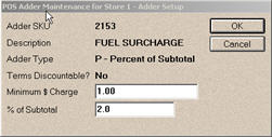 If you selected Adder Type P, enter the Minimum $ Charge and the % of Subtotal. Then click OK