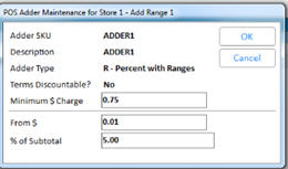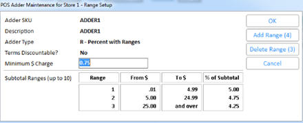 If you selected Adder Type R, enter the Minimum $ Charge, the From $ Amount and the % of Subtotal for the first range, and click OK. Then in the next dialog that displays, click Add Range to add the next range. Based on the subsequent range, the system automatically enters the "From$" field of the previous range . You can add up to 10 ranges. When finished, click Cancel to end the session.