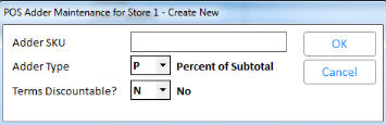 In the Create New dialog that displays, enter the Adder SKU, select the Adder Type, and select whether or not this adder amount will be terms discountable. Then click OK.