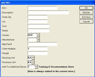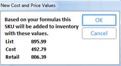 You can use the Recalc button to preview the prices the system will calculate based on the formula you entered in the Retail field. If you click OK, the system pastes the calculated values into the Cost and Retail fields in the add dialog box, and uses the calculated values when adding the item to inventory. If you click Cancel, the add dialog box displays with the formula in the cost and retail fields, giving you the opportunity to set different values.