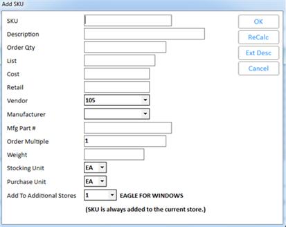 In the Add SKU dialog, fill in the fields. Minimally, you must enter a SKU (unless you set up option 8718 to auto-generate SKUs), Description, and Order Quantity. All other fields will use the template SKU value if they are left blank. Multistore users: If you want to add the non-stock item to additional stores, select the appropriate stores in the Add To Additional Stores field (Note: the default stores/store groups in this field come from option 8457 “Default store group for Quick Add of Non-Stock items in POS”)