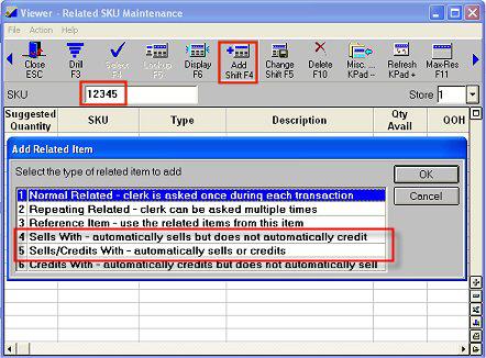 Click Add. The Add Related Item dialog displays. Select 4— Sells With"Sells With" automatically posts the Sells With item when the parent SKU is sold in a sale transaction. For example, if a customer buys a soft drink, you can set up the "redemption value" as a "Sells With" item.