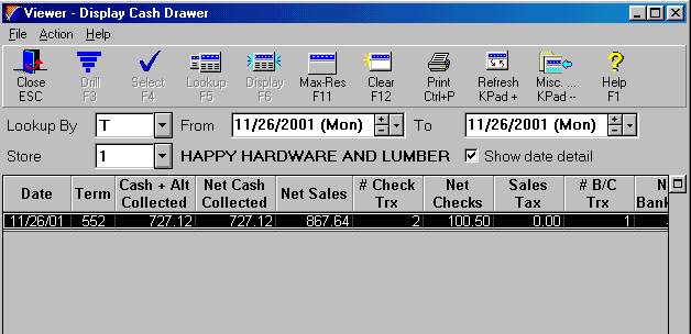 The Display Cash Drawer viewer displays. Today's current totals by terminal automatically display in the grid.