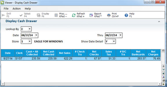 In POS, with your cursor in the Item (SKU) field, select Menu. Then select Display Cash Drawer (you can also access the application by typing DCD in the Launch bar of the Eagle Browser, and then pressing Enter).