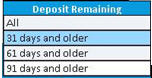 Multiple deposits on an order can’t be aged as separate deposits, because the data doesn’t track them separately. Aging uses the first deposit taken on the order, and the amount remaining is after all deposit activity for that order has been applied.