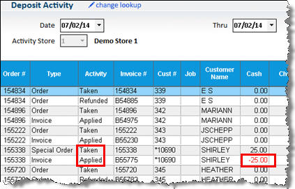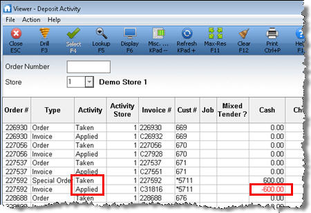Notice that each order can have multiple entries in the grid, based on the various stages of the deposit(s) on the order. The Action field describes these various stages: whether the deposit was "taken," "applied," or "refunded." The Transaction Type field indicates "Order" if the deposit was taken or refunded, and indicates "Invoice" if the order was invoiced or partially invoiced.