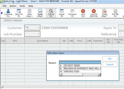 In POS, when ringing up a credit item (either a line-item credit, or an item on a credit memo transaction), the system prompts you to select the type of return (regular return, return for defective, or exchange for defective), as it normally does. Then the system prompts you for a return reason. Select a return reason and press OK.