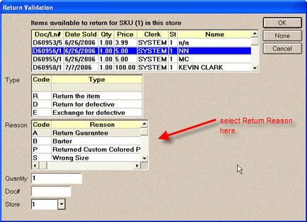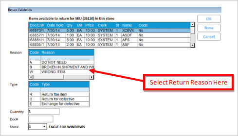 If you use Returns Validation, you select a return reason on the same screen where you select the transaction to which you want to apply the return.