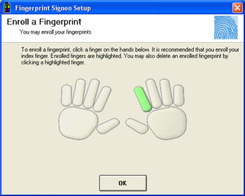 From the Fingerprint Signon Setup screen, click the finger you want to set up to use for signon, and click OK.
