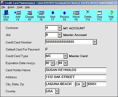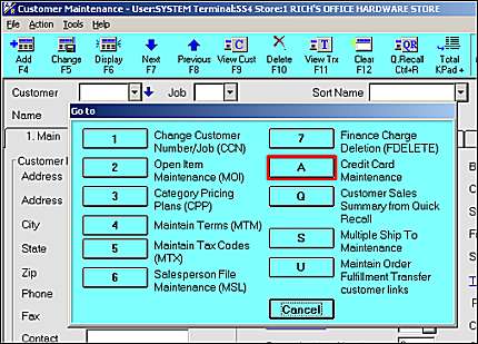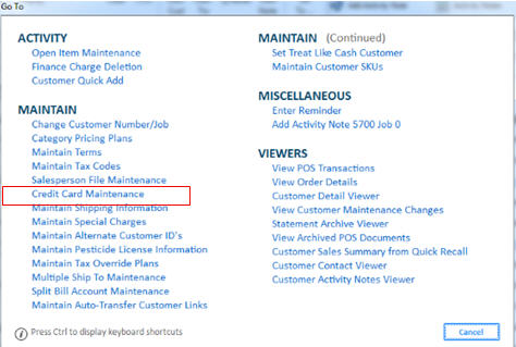From the Customer Maintenance window, click GoTo, and select Credit Card Maintenance.