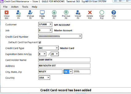 In the Credit Card Maintenance window that displays, fill out all the fields for the customer credit card you're adding. Be sure to check the field "Default Card for Payment" if you want the card number you're adding to display first at POS for that customer.