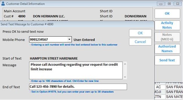 Texting customers on demand – From POS, enter the customer in the header (mini or big) and press <Display>. Or from MCR, MOI, ROA, or POS bring up the Customer Viewer highlight the customer you want to text and press <Display>. In the Customer Detail Information dialog, click <Send Text> to display the dialog below. Enter or select the customer’s cell number in “Mobile Phone” and enter your message in Message (up to 100 characters). You may also extend your message to up to 130 characters by overwriting the End Text which defaults to the value in Option 1679. Once the user presses OK, the text will be sent to the customer.