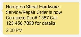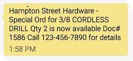 This is an example of the text message which will be sent where option 1678 is blank so the start of the text is the store’s Short Name (i.e. "Hampton Street Hardware”), and option 1679 is configured for the text “Call 123-456-7890 for details”.