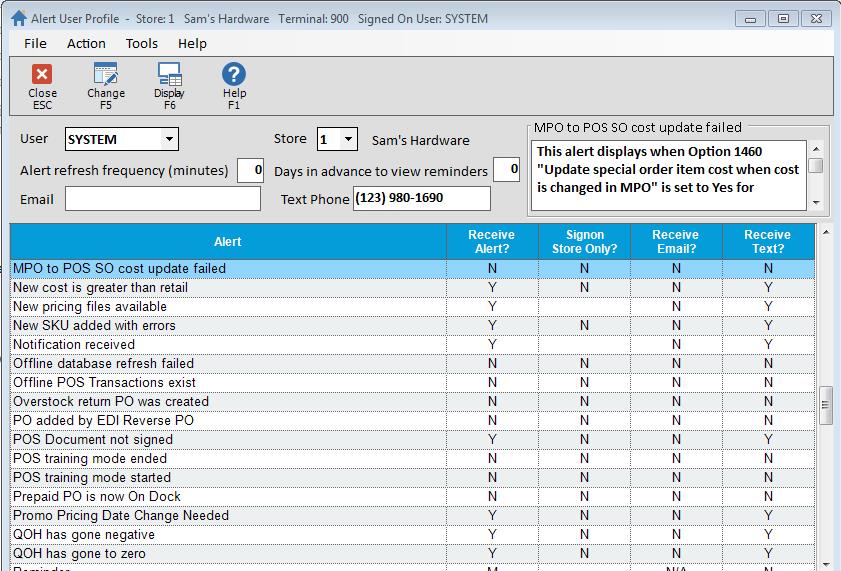 Special Order item received – if you are using the features of “Advanced Special Orders” (option 1028 "Special Orders Allowed at POS" = A) and would like to offer the customer a text notification when the item has been received, enter an S in the new Option 1674 “Send text message notifications to customers for these events”. This capability applies to items on Special Order and Order transactions which are sourced to a PO (the item on the customer order has the link to the PO). If a cell number is entered on the special order or order transaction a text will be sent when the RRP option F finalizes the receipt.